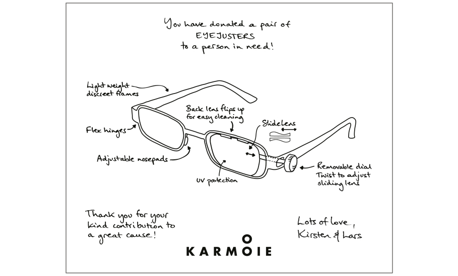 By purchasing a pair of Karmoie frames you will donate a pair of Eyejusters to a person in need. Imagine what a life altering contribution! Along with every pair you will find a card with a unique donation number, so you can stay involved and follow up on your contribution. You can also register for our newsletter to stay up to speed with Karmoie’s efforts both in creating new collections and helping people all over the world regain their sight.